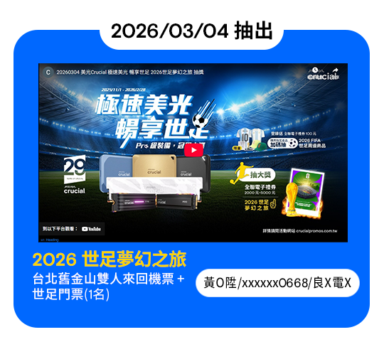 凡於台灣各大通路經銷商購買指定美光 Crucial 全系列產品並完成線上登錄,即可獲得全聯電子禮券 100 元!購買 Crucial Pro 系列產品再享加碼抽獎,限量世足周邊等你收藏,更有機會角逐壓軸大獎包含全聯電子禮券 2,000 元、全聯電子禮券 5,000 元,以及終極大獎 2026 世足夢幻之旅,帶你親臨現場感受最熱血的足球榮耀!立即擁有 Crucial Pro,熱血衝向世足現場!​